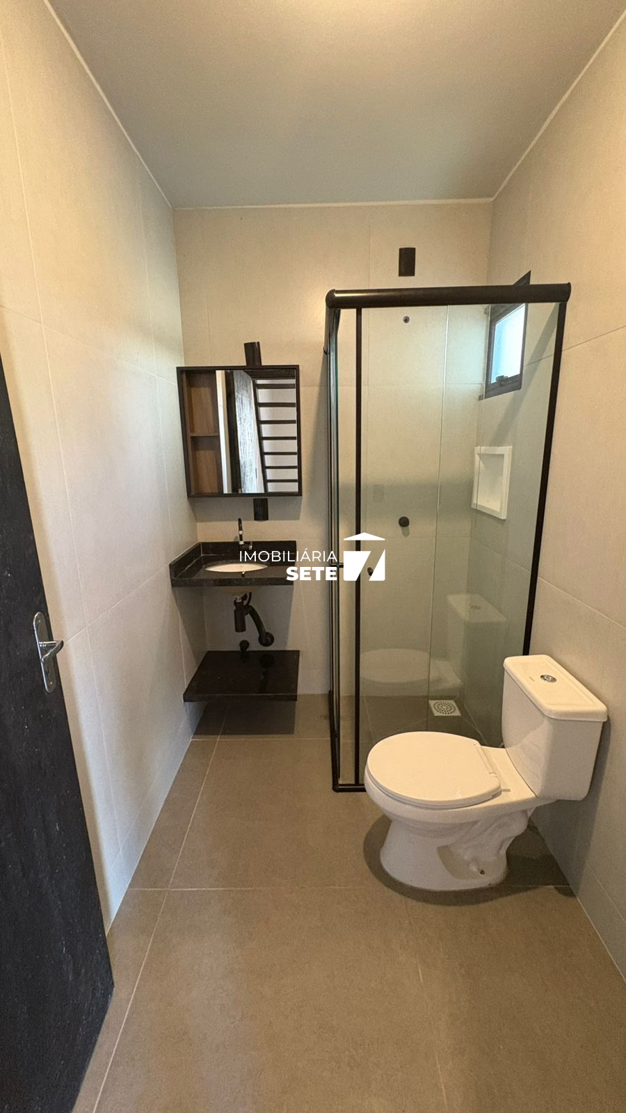 🔹 Banheiro: box de vidro, pia de mármore e espelho